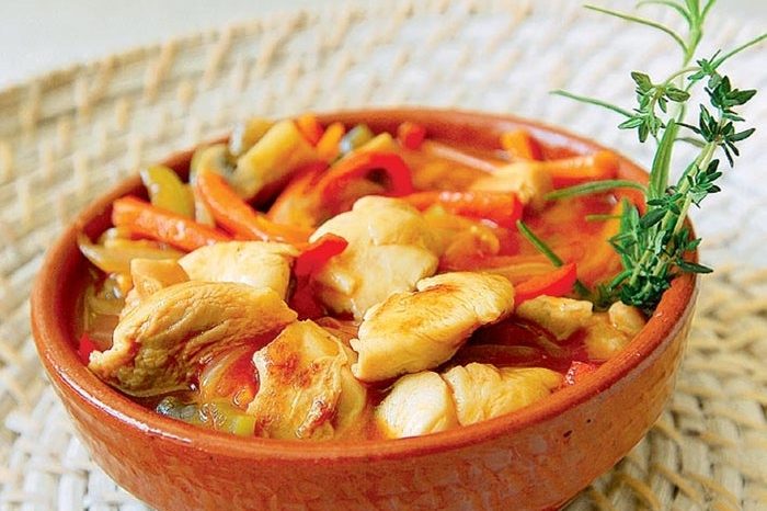 Ingredientes: 1/2 kg. de carne de pollo, 1/2 kg cebolla, 1/2 kg zapallo, 300 gr zanahoria, 2 cebollas de verdeo, 1 morrón rojo, 1/2 lt de vino blanco, 1/2 lt caldo de pollo, 200 cc crema de leche, sal, pimienta, ají molido, Salsa de ajos asados