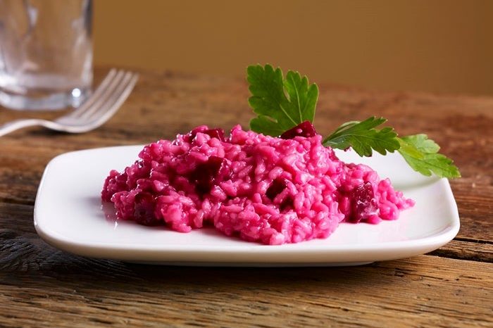 Ingredientes: 1 cebolla colorada, 1 diente de ajo, 240 cc vino blanco, 4 tazas de caldo de verduras, 6 tazas de arroz carnaroli, 1/2 taza queso blanco, 1/2 taza queso rallado, puré de 2 remolachas, 30 cc de salsa de ajos.