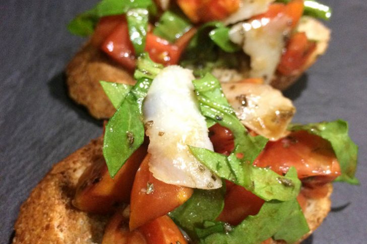 Ingredientes: Rodajas de pan integral, tomates, rúcula, tomillo, aceite de oliva, Salda de ajos asados, quedo parmesano.