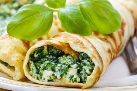 Ingredientes: 1 taza de espinacas, 150 gr harina de avena, 2 huevos, 150 ml leche, sal, aceite de maíz, salsa de ajos asados, queso crema.